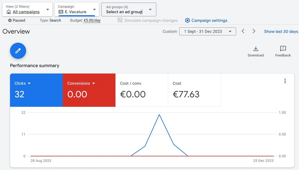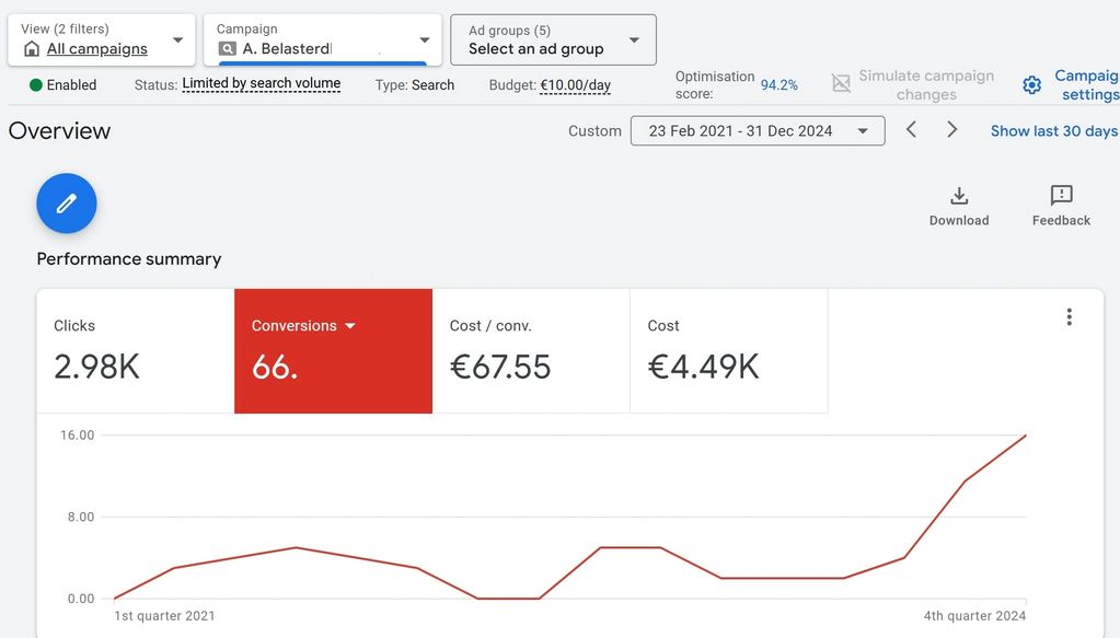 Met doelgerichte Google Ads-campagnes trok ik sinds 2021 maar liefst 16.000 relevante bezoekers en genereerden 532 leads, tegen een scherpe leadprijs van € 13,47